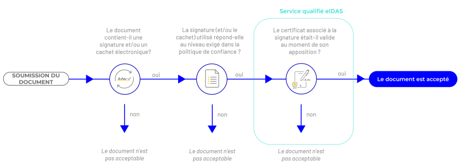 Pour ce faire, le système procède à l’identification du signataire et à l’interrogation des services externes, avant d’établir son rapport de validation. Ce n’est qu’à l’issue de ces différentes étapes que le système détermine l’acceptabilité ou le refus du document.