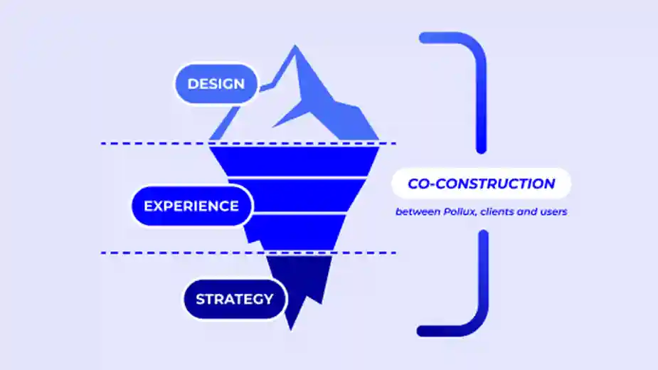 The iceberg metaphor illustrates the co-design work between the "visible" aspect of an experience (its design) and the invisible "hidden" aspects such as vision, business strategy, and UX design. Pollux focuses on: