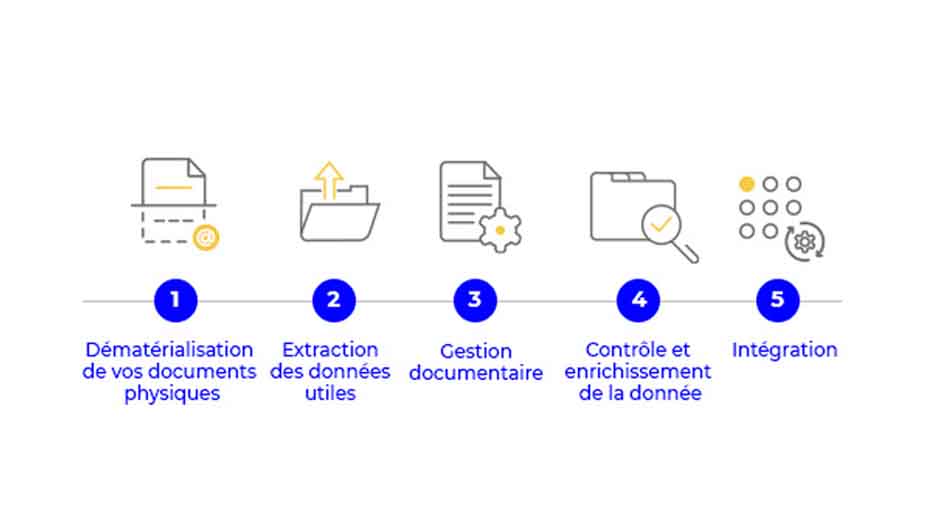 Docaposte maîtrise toute la chaine de confiance de la dématérialisation, de la réception des flux documentaires à leur archivage à vocation probatoire, en passant par le traitement de la donnée issue de ces documents. Nous opérons la dématérialisation chez nos clients (in situ) ou sur nos plateformes industrielles.