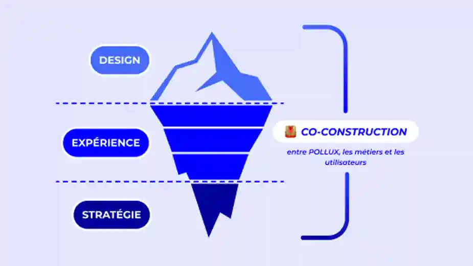 La métaphore de l’iceberg illustre le travail de co-conception entre l'aspect « visible » d'une expérience (son design) et les éléments invisibles « cachés » telles que la vision, la stratégie business et la conception UX. Pollux s’attache à :